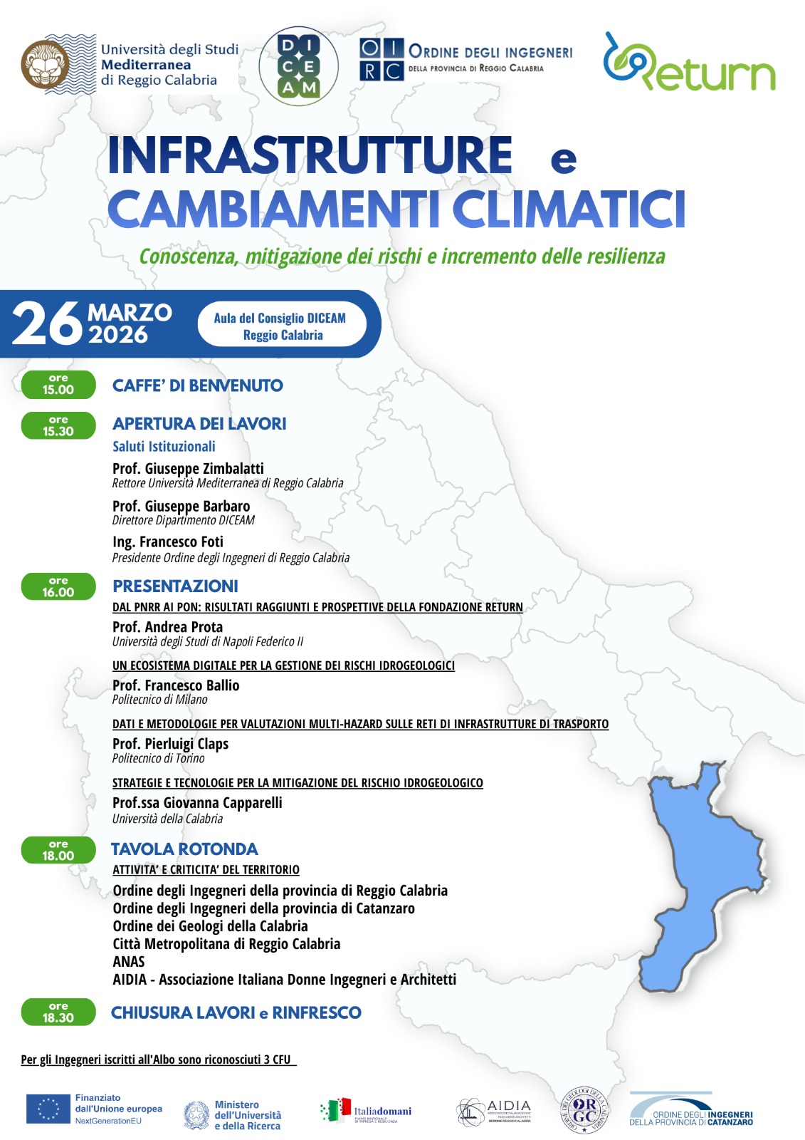 Il giorno 26 marzo alle ore 15, nell’Aula del Consiglio DICEAM di Reggio Calabria, si terrà il convegno Infrastrutture e Cambiamenti climatici.